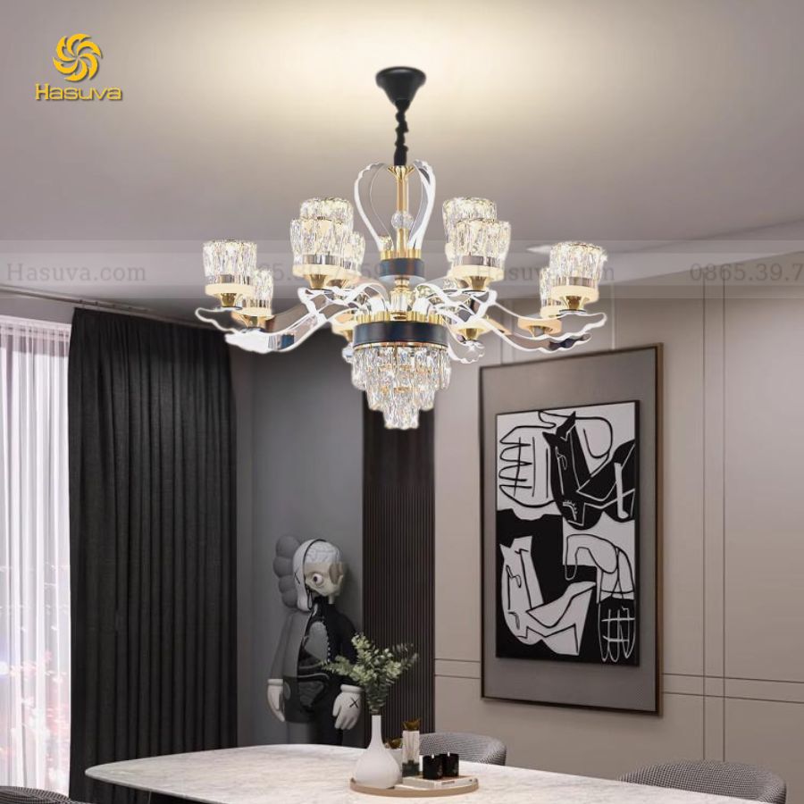 - Từ cổ điển đến hiện đại: Bạn có thể tìm thấy những chiếc đèn chùm mang phong cách cổ điển với nhiều hoa văn tinh xảo, hoặc những thiết kế tối giản, hiện đại giúp không gian thêm phần sang trọng.